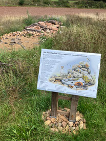 Anschließend wurde ein Steinhaufenbiotop für Reptilien und andere Lebewesen gebaut. Dafür musste zunächst ein sechs Quadratmeter großer Bereich ausgeschachtet werden, was hauptsächlich durch V. Höpp in mühseliger Handarbeit erfolgte. Anschließend wurde kleinere und größere Lesesteine und Baumstämme in der Grube aufgeschichtet. Hierzu war auch schweres Gerät (Traktor von W. Brede) im Einsatz. So wurde eine frostsichere Reptilienburg geschaffen.