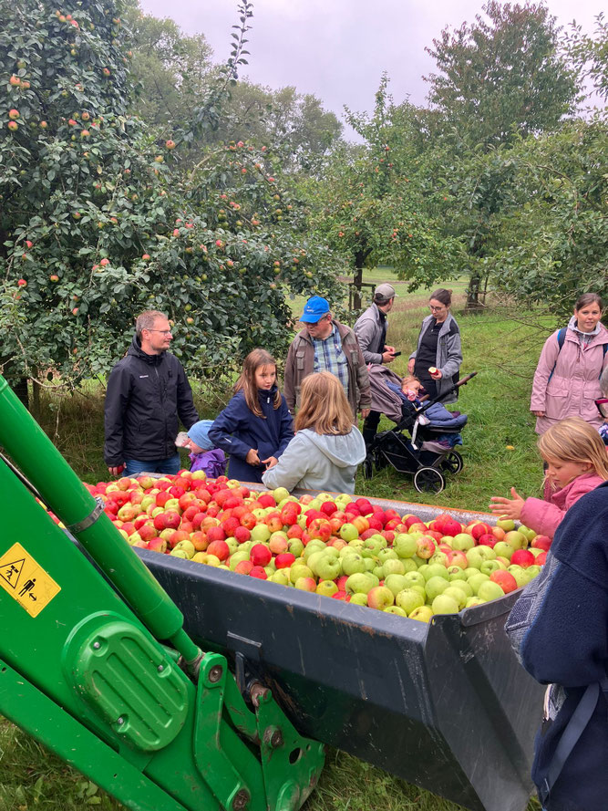 15 Erwachsene und 10 Kinder hatten bei der in diesem Jahr großen Fülle an Äpfeln innerhalb kurzer Zeit die Frontladerschaufel des Treckers mit leckeren Äpfel befüllt.